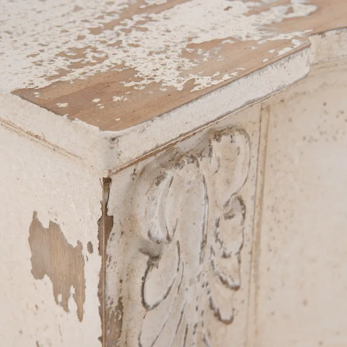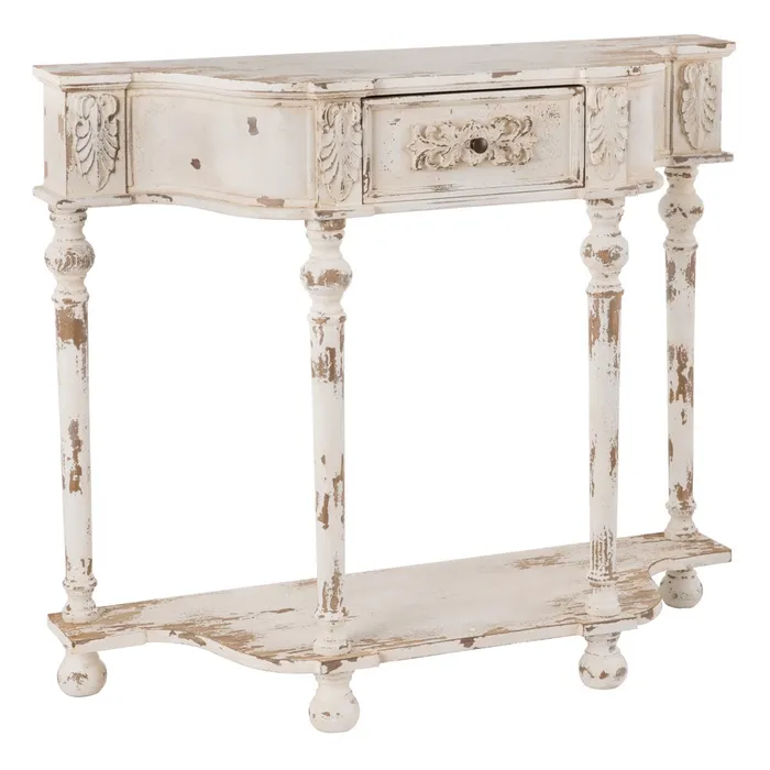 Consola en blanco rozado fabricada con el más detalle, tenemos esta consola en color blanco rozado. Material: Madera de abeto. Dimensiones: 118×38,5×101 cm. Ref: FAIX601991.